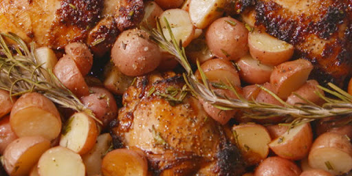 In a large skillet over medium-high heat, heat remaining tablespoon oil. Add chicken and marinade and sear, skin side down, 2 minutes, then flip and sear 2 minutes more. Add potatoes to skillet, nestling them between chicken, and rosemary sprigs.