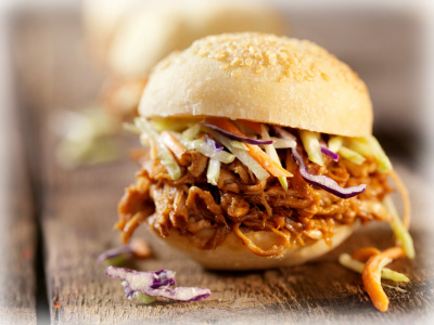 Tender enough to be shredded with a fork, pulled pork makes an easy buffet mainstay. Offer buns (to pile high with pork), pickled jalapeno peppers, shredded Cheddar cheese and light sour cream.
