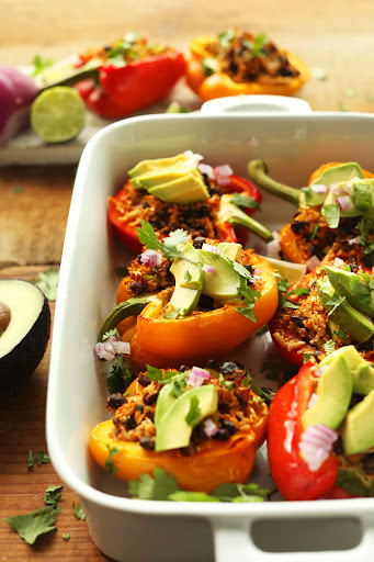 Generously stuff halved peppers with ~ 1/2 cup of the mixture until all peppers are full (you may have a little leftover filling, which can be added to salads or served on the side), then cover the dish with foil.