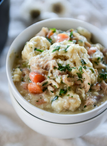 Top the entire pot with fresh chopped parsley. This is a very dumpling heavy recipe, which I adore. Serve immediately! I love how this reheats - just add a bit of stock or milk when reheating!