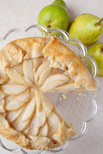 For the galette: Preheat oven to 400ºF. Roll pastry crust into a 12-inch circle. Transfer crust to a baking sheet. Spread pastry cream in the center, leaving approximately a 2-inch border. Arrange the pear slices on top of the pastry cream. Sprinkle with the flour and salt. Fold edges of the crust over the pears. Lightly brush the surface of the crust with the egg wash. Bake until the crust is golden, about 30-40 minutes. Place on a cooling rack and drizzle exposed pears with honey. Cool before serving.