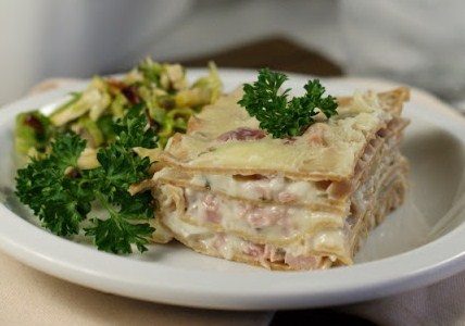3. In a 9x13" baking dish coated with non-stick cooking spray, arrange three lasagna noodles and top with 1/4 of the ham mixture. Repeat to create three more layers of noodles and sauce. Sprinkle the remaining cup of shredded Monterey Jack cheese on top.