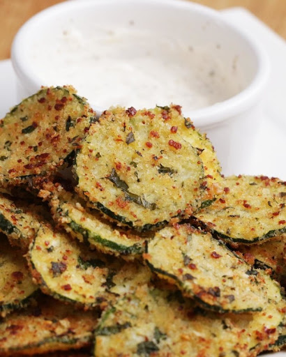 5. Take a zucchini slice and dip it in egg wash, then coat it in bread crumb mix, coating all sides and patting mixture onto both sides. Repeat for all slices.