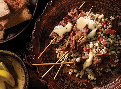 Steak Satay with Lemon Tahini Sauce and Tomato-Couscous Salad