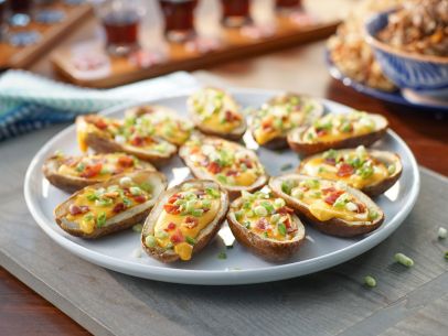 Arrange the potato skins on a platter and drizzle with the beer cheese. Top with the bacon and scallions. Serve immediately.
