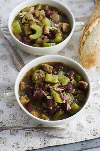 While the onion and garlic are cooking, mash 1 cup of the kidney beans with a potato masher or fork, then add them to the saucepan. Add the celery, pepper, remaining whole beans, chicken broth and bay leaf. Bring the mixture to a boil, then reduce to a simmer and cook for 15 minutes, stirring occasionally.