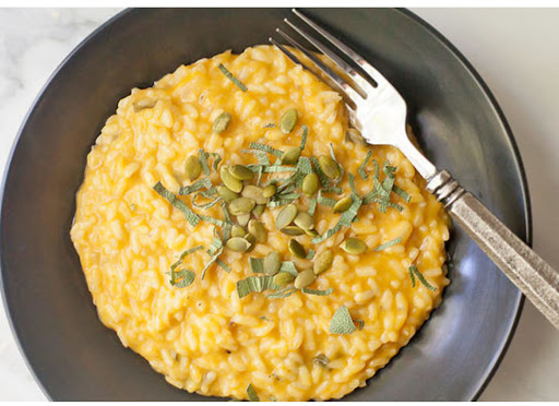 When the risotto is tender and creamy, remove from heat. Season with salt and pepper to taste, and then stir in the remaining butter, Parmesan and pumpkin until cheese and butter are melted. Serve immediately topped with additional sage leaves and pepitas.