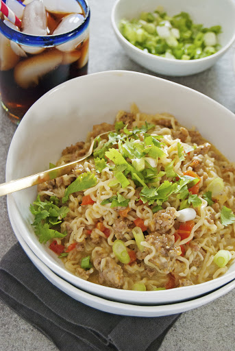 Heat olive oil in a large cast iron skillet over medium-high heat. Add white onion and bell pepper and cook for about 8-10 minutes, until the onion begins to glisten. Add ground pork and cook until browned, using the back of a wooden spoon to break up the meat. Cook for about 10 minutes, until meat is no longer pink and is beginning to brown. Add Italian seasoning and stir until evenly distributed. Add white wine to deglaze the pan, scraping up brown bits from the bottom of the pan with a wooden spoon. When wine has almost evaporated, add chicken stock and ramen, stirring to combine evenly. Make sure all the ramen pieces are covered with chicken stock so that they cook properly. Allow to cook until Ramen is cooked through and sauce has thickened, about 3-5 minutes. It may be necessary to remove some excess liquid with a spoon. Add shredded cheddar cheese and stir until combined. Allow to cook over low heat for 3-4 more minutes to thicken. Serve with fresh cilantro and green onions. Enjoy!
