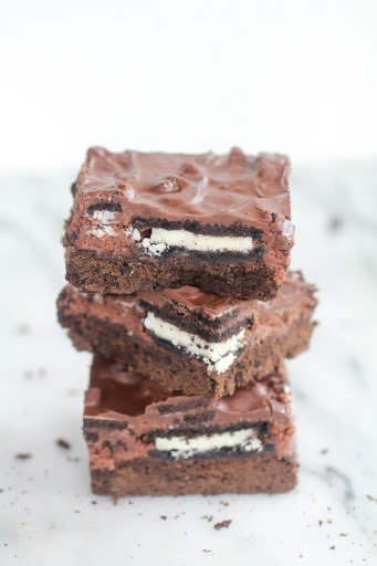 3.In a stand mixer, or with a hand mixer, beat the cream cheese until smooth. Add the remaining 2 eggs, and the cocoa powder. Lower the speed of the mixer, and add the powdered sugar. Continue beating until ingredients are well mixed. Slowly add the remaining 1 stick of melted butter, and the vanilla, continuing to beat the mixture until smooth. Spread the filling over the cake mixture in the pan. Press 18 whole Oreos into the filling (the filling will begin to spill over the oreos, but it probably will not completely cover the oreos). Bake for 40 to 50 minutes. Be careful not to overcook the cake. The center should still be a little giggly when finished baking. Let sit five minutes.