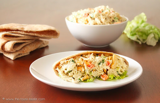 In a small bowl whisk together the mayo, sour cream, and curry powder. Set aside. In a larger bowl combine the cooked chicken, green onions, and red pepper. Pour curry dressing over chicken mixture and toss until mixed well. Salt and pepper to taste. Toss in cashews right before serving. We love to eat this in whole wheat pitas or on whole wheat bread.