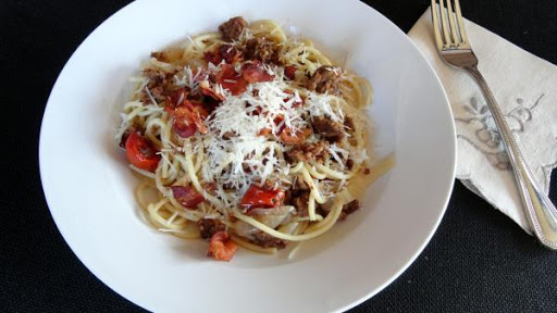 4. Add garlic, tomatoes, sausage, and vinegar. Add chicken stock and cook 30 minutes. Mix in pasta may need about 1/2 to 1 cup pasta water. Mix into the sauce, pour into a pretty bowl top with bacon and cheese.