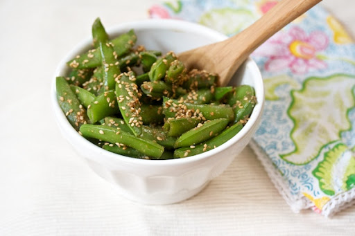 Place the sugar snaps in a medium bowl and toss with the dressing. This is best at room temp. You can make this a few days in advance and keep in the fridge and then just let come up to room temp before serving. Garnish with a few extra toasted sesame seeds.