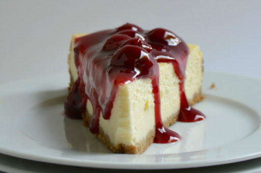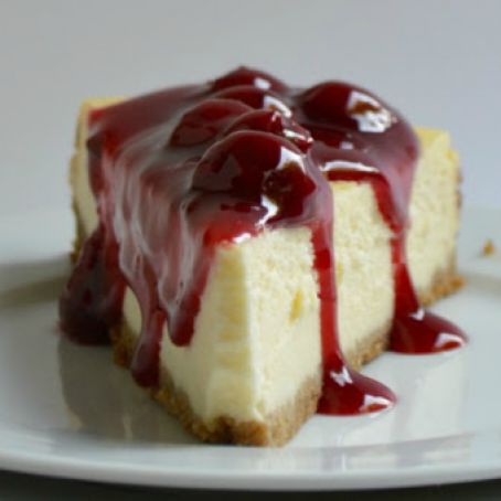 After the baking time is up, gently shake the pan back and forth. The cheesecake should be evenly baked through and uniformly wobbly, but if only the centre is wobbly (about the size of a baseball or roughly 10 cm), it is also fine. Remove cheesecake from oven and carefully run a knife along the edge to loosen the cheesecake from the pan. Place it back in the oven with the heat turned off. Leave the cheesecake over night, with the oven door shut. Put the cheesecake in the fridge the next day for a minimum of 4 hours and up to 24 hours. Top with cherry pie filling or your favorite topping before serving.