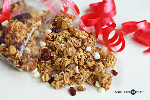 Break apart each package of ramen, discarding the seasoning packet or saving it for another use. Pour broken ramen, sliced almonds, and dried cranberries into honey and butter mixture. Stir until entire mixture is coated.