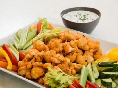 Set the oven to broil. Broil the cauliflower until tender and the coating is crispy, 2 to 3 minutes. Let cool briefly before serving with the dipping sauce. Serve carrot sticks, celery sticks, bell pepper strips and cucumber slices alongside.