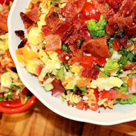 This is my base salad, sometimes I omit the pasta, sometimes I add chicken breast or shrimp. Please take this base salad and make it your own. If you don't like bacon (who doesn't) don't add it. Also, I serve this with extra salad dressing on the side. My baby girl does not like dressing she just loves the vinaigrette, I on the other hand likes to add ranch dressing to my salad.