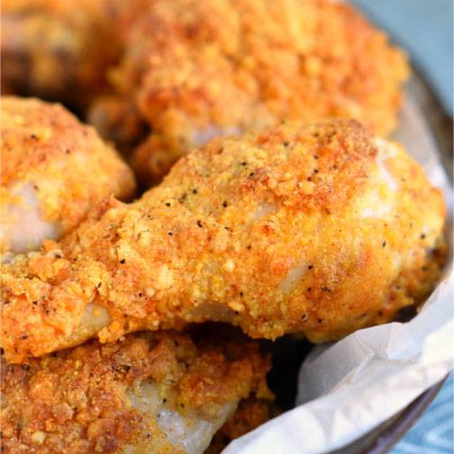 Bake for 35 to 40 minutes or until chicken is cooked through and juices run clear. Check the chicken at about 30 minutes and if the coating is turning too brown, just place a piece of foil lightly over the top of the chicken to prevent further browning.