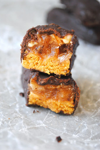 Spread date sauce over the nougat layer. Top with nuts; freeze for 1 hour.