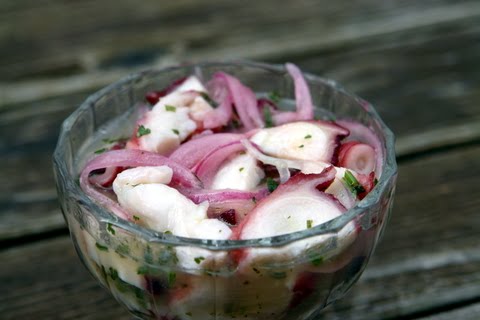 Limpiamos y secamos el pulpo y lo cocemos. Una vez cocido, lo troceamos y reservamos en una fuente sin agua.