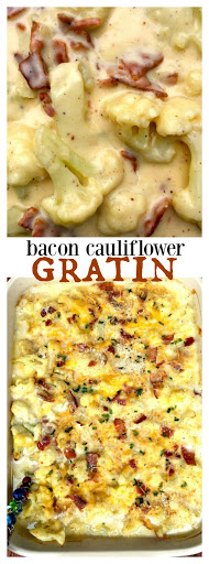 Add the cauliflower and bacon to the cheese mixture and toss to combine. Pour into an 9x13 baking dish and top with bread crumbs and a sprinkle of cheese.