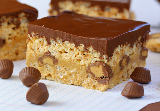 Spread the fudge over the 1st layer of Krispie treats and scatter the mini peanut butter cups over the top, pushing cups into the fudge. Refrigerate until cool and firm enough to handle second layer of treats, about 1 hour.
