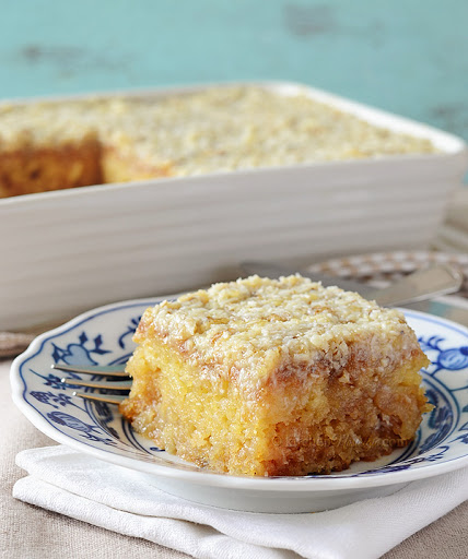 While cake is still hot, poke it with a skewer to help frosting soak into cake. Immediately pour frosting over it.