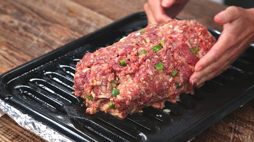 Transfer meat to pan or tray and gently press together to shape into loaf. Do not over compact. Combine glaze ingredients and spoon over the top of the loaf. Bake for about an hour, or until internal temperature reaches 160 degrees F on an instant read thermometer, carefully pouring off fat occasionally if using a regular baking pan. Total cooking time will vary depending on your own oven and how thick you shape the loaf.