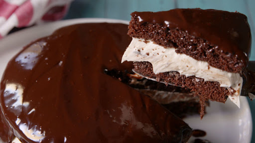 Top one round cake with marshmallow frosting, then place the second cake on top of it. Pour ganache over the cake.