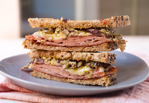 5) Toast bread and slide mortadella stack onto bread. Smear with tapenade and serve immediately!