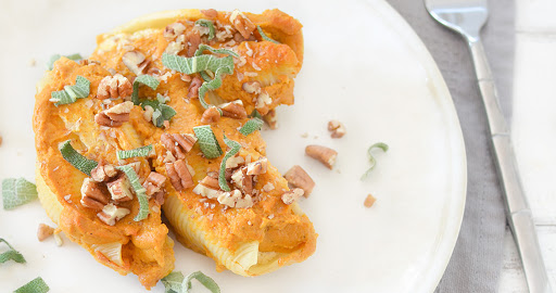 To assemble the stuffed shells, place 1 cup of the butternut sauce on the bottom of a 9x13" pan. Spoon a large dollop of the tofu mixture into each shell and place in the dish. Continue with the rest of the shells, then top with the remaining butternut sauce.