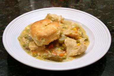 To serve, split a biscuit and spoon some of the chicken and vegetables over the bottom half. Put the top half of the biscuit on the chicken and gravy.
