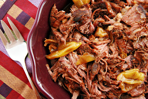 Place roast in the slow cooker and sprinkle with a little black pepper and a little seasoned salt. Sprinkle the top with the ranch dressing mix and the au jus mix. Place peppers on top of mixes. Add the stick of butter on top.