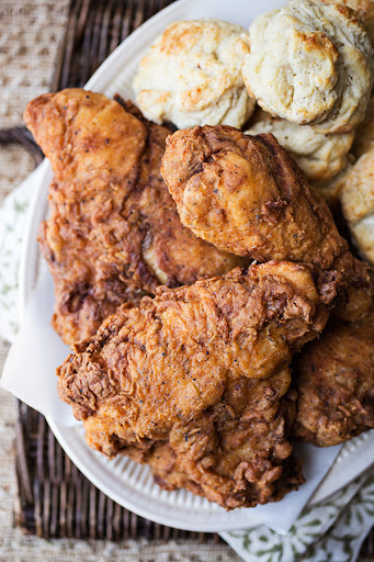 -Add enough oil to a large pot or a large, deep, cast-iron skillet to come up about half way (do not fill more than that), and bring the temperature of the oil up to 350°; once the oil is hot, fry the chicken pieces in batches of two or three, turning once or twice, until golden brown and cooked through, about 8-10 minutes for white meat, and 13-14 minutes for dark; remove and drain on a clean wire rack set over a paper towel or foil-lined baking sheet to catch any grease/drippings; serve while hot,or enjoy cold!