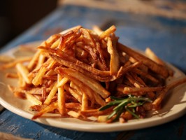 Add the fries, in batches if necessary, to the oil and cook, stirring gently, until the fries are golden brown, about 5 minutes. Remove them from the oil to a large paper-towel-lined bowl and season them with the rosemary and salt, shaking the bowl to distribute the seasonings evenly.