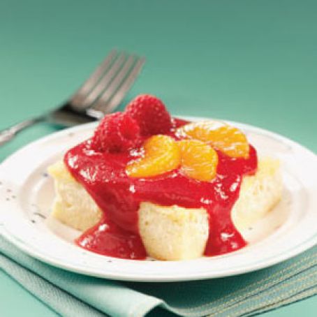 For topping, press raspberries through a strainer; discard seeds and pulp. In a small saucepan, combine cornstarch and orange juice until smooth; stir in raspberry puree. Bring to a boil. Cook and stir for 2 minutes or until thickened. Serve with blintz bake. Top with mandarin oranges if desired.
