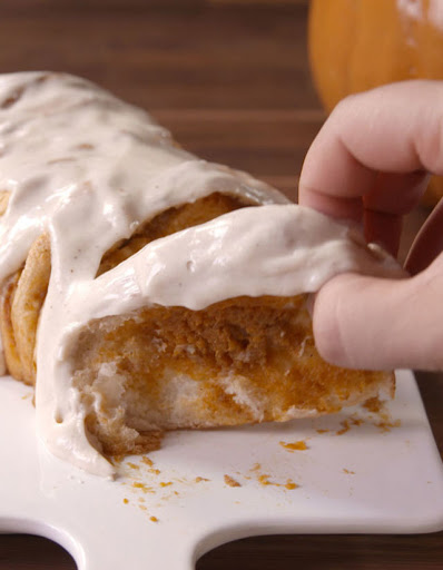 6. Make the cream cheese frosting: Use an electric mixer to beat the cream cheese until light and fluffy. Add powdered sugar, vanilla extract, and pumpkin pie spice, mixing on low until combined. Gradually add milk, mixing until it’s a pourable consistency. Pour on top of warm pull-apart bread and serve.