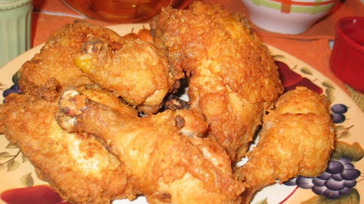 Melt butter and Crisco in a large frying pan over medium heat (about 350°F.) Place chicken in pan. Fry, turning as chicken browns. Heavy parts such as breast, thighs, and legs will take 15 to 20 minutes, wings about 10 to 15 minutes. Drain chicken on paper towels. Can keep warm in preheated oven (350 degrees).