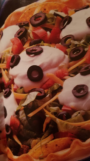 4. Top with lettuce, remaining 1/2 cup cheese, tomato, onion, sour cream and olives. Serve immediately.