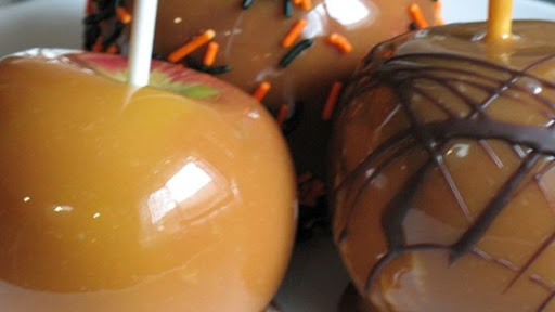 Roll each apple quickly in caramel sauce until well coated. Place on prepared sheet to set.