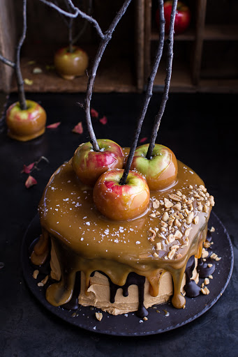 When the caramel has cooled (it should be a little thicker now, but still pourable), pour about half the caramel over the cake and allow it to fall down the sides of the cake. Working quickly, dip the apples into the remaining caramel and place the in the center of cake. Sprinkle the cake with flakey salt and peanuts. Make room in the fridge for the cake and refrigerate until firm, at least 30 minutes. The caramel should never get completely hard, but should be more of a soft firm. Once the caramel is firm, store the cake in the fridge until ready to serve. Allow the cake to sit 15 minutes at room temp before serving. Please not that this is a delicate and with all the toppings it is a bit tricky to slice. Your slices will not be perfect.