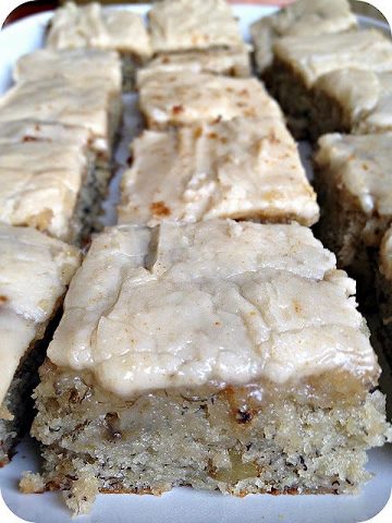 For the bars, in a large bowl, beat together sugar, sour cream, butter, and eggs until creamy. Blend in bananas and vanilla extract. Add flour, baking soda, salt, and blend for 1 minute. Stir in walnuts.