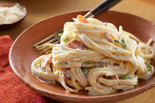 Drain spaghetti. Immediately add to skillet with bacon mixture and all remaining ingredients; toss until cream cheese is completely melted and mixture is well blended.