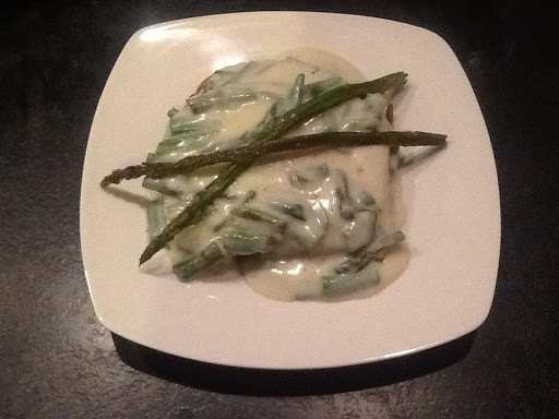 Chop roasted asparagus into 1 inch pieces and add to sauce. Save 8 stalks (2 per serving) for garnish.
