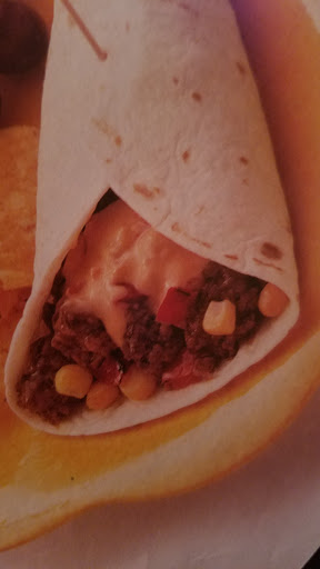 4. Spoon about 1 cup beef and corn mixture down center of each warm tortilla. Top with 2 tablespoons cheese and salsa dip. Roll up like a burrito, and serve.