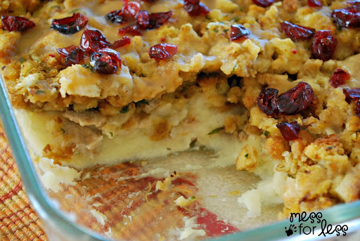 Combine remaining mayo, potatoes and cheese in a large bowl. Evenly spread on turkey, then top with remaining stuffing.