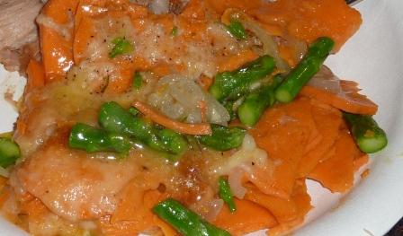 In a large lasagna pan, layer sliced potatoes, asparagas, and shallots. Cover with coconut milk mixture. Add butter. Season with seasonings. Sprinkle with cheese. Cover with foil and bake for about one hour or until potatoes are softened. Remove foil and turn broiler to low. Broil just until the cheese starts to brown.