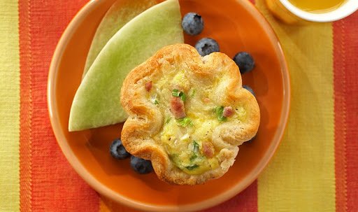 SEPARATE biscuits; press or roll each into a 5-inch round on lightly floured surface. PLACE 1 biscuit in each of 10 greased muffin cups, leaving the 2 cups in center of pan empty. PRESS biscuits firmly against bottom and sides of cups and form rim at top.