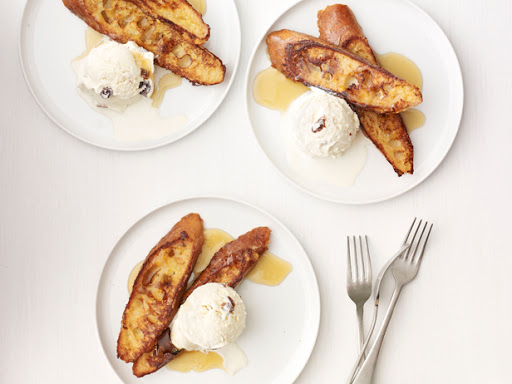 Meanwhile, mix the maple syrup and the remaining 1 tablespoon rum in a small microwave-safe bowl; microwave until warm, about 1 minute. Serve the French toast with the maple-rum syrup and ice cream.