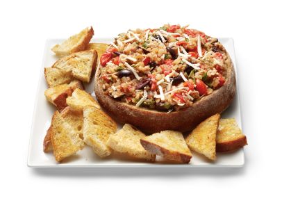 Stir the basil and cheese into the vegetable mixture; season with salt and pepper. Fill the loaf with the dip and top with more cheese. Drizzle with olive oil and serve with the toasted bread and crackers and/or crudites.