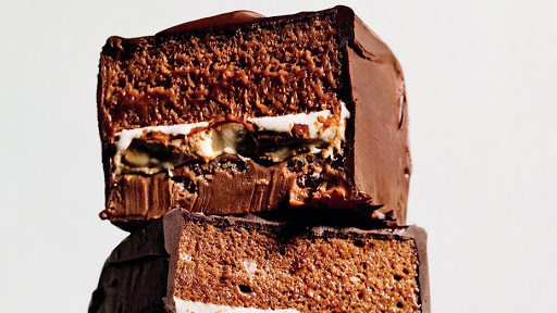 Line a baking sheet with parchment paper. Invert 8" pan onto a work surface; remove pan and peel off plastic. Turn over. Cut into 6 slices, then halve each slice crosswise. Transfer pieces to prepared baking sheet, base side down. Using an offset spatula, spread chocolate over tops and sides of bars. Freeze to set, 30 minutes.
